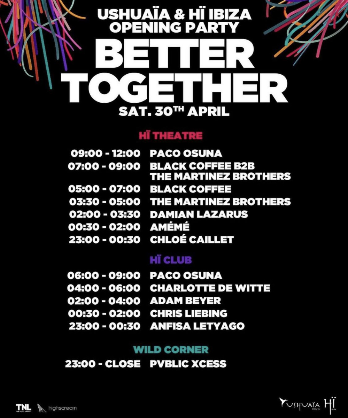 BETTER TOGETHER · OPENING PARTY + Add to Google Calendar + iCal / Outlook export Date 30 Apr 2022 Expired! Time All Day Location HI IBIZA Location 2 USHUAIA IBIZA Playa d'en Bossa 10, 07817, Sant Jordi de Ses Salines, Ibiza Club HI IBIZA Otheer Clubs USHUAIA IBIZA Phone +34 971 396 710 Email reservations@ushuaiabeachhotel.com Website http://www.theushuaiaexperience.com Artist ADAM BEYER ADAM BEYER AMÉME AMÉME ANFISA LETYAGO ANFISA LETYAGO BLACK COFFEE BLACK COFFEE CHARLOTTE DE WITTE CHARLOTTE DE WITTE CHLOÉ CAILLET CHLOÉ CAILLET CHRIS LIEBING CHRIS LIEBING DAMIAN LAZARUS DAMIAN LAZARUS PACO OSUNA PACO OSUNA PVBLIC XCESS PVBLIC XCESS THE MARTINEZ BROTHERS THE MARTINEZ BROTHERS Share this event