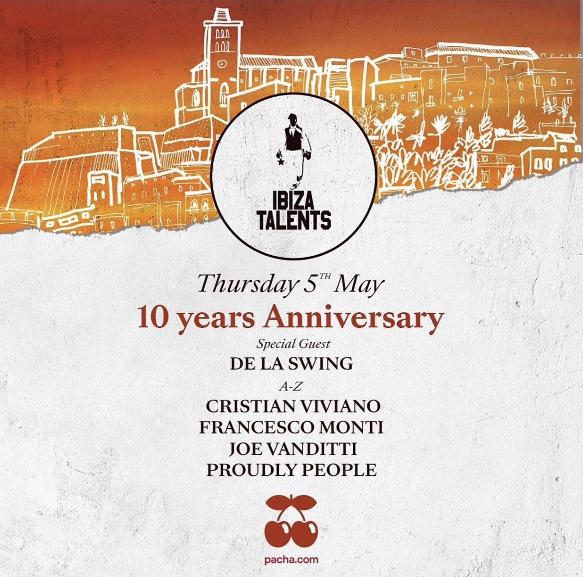 IBIZA TALENTS · 10 YEARS ANNIVERSARY + Add to Google Calendar + iCal / Outlook export Date 05 May 2022 Expired! Time All Day Event Label IBIZA TALENTS Location PACHA IBIZA Club PACHA IBIZA Artist CRISTIAN VIVIANO CRISTIAN VIVIANO DE LA SWING DE LA SWING JOE VANDITTI JOE VANDITTI PROUDLY PEOPLE PROUDLY PEOPLE Share this event