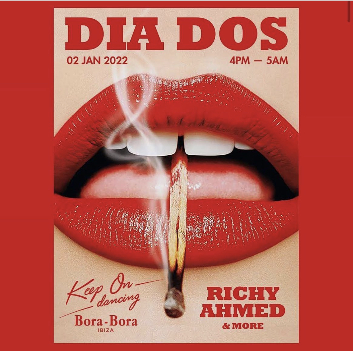 KEEP ON DANCING · DIA DOS + Add to Google Calendar + iCal / Outlook export Date 02 Jan 2022 Expired! Time All Day Event Label KEEP ON DANCING Location BORA-BORA IBIZA 07817 Sant Josep de Talaia, Balearic Islands Club BORA-BORA IBIZA Website http://www.boraboraibiza.net The best atmosphere on the island is found in Bora Bora. A place as special as it is magical, where things happen... "WHAT HAPPENS IN IBIZA STAYS IN BORA BORA" Artist RICHY AHMED RICHY AHMED Share this event
