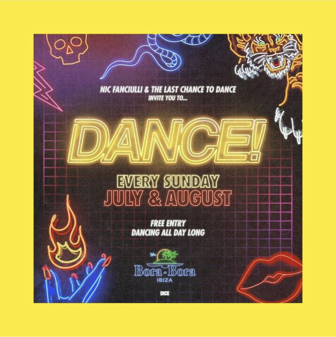 NIC FANCIULLI & THE LAST CHANCE TO DANCE · DANCE + Add to Google Calendar + iCal / Outlook export Date 03 Jul 2022 Expired! Time All Day Location BORA-BORA IBIZA 07817 Sant Josep de Talaia, Balearic Islands Club BORA-BORA IBIZA Website http://www.boraboraibiza.net The best atmosphere on the island is found in Bora Bora. A place as special as it is magical, where things happen... "WHAT HAPPENS IN IBIZA STAYS IN BORA BORA" Artist NIC FANCIULLI NIC FANCIULLI Share this event